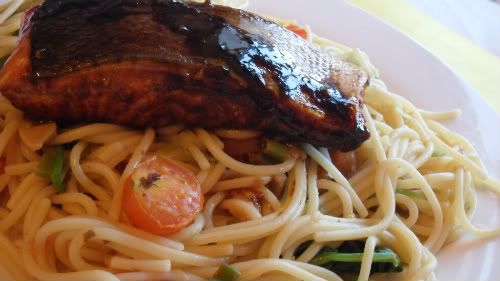 3. Place salmon in the pan skin side down and fry for 5 minutes (adjust time according to the thickness/size of the fillet, but don't worry too much about overcooking/drying - it's cooking in sauce!). Once you turn the fish over, start on the spaghetti.